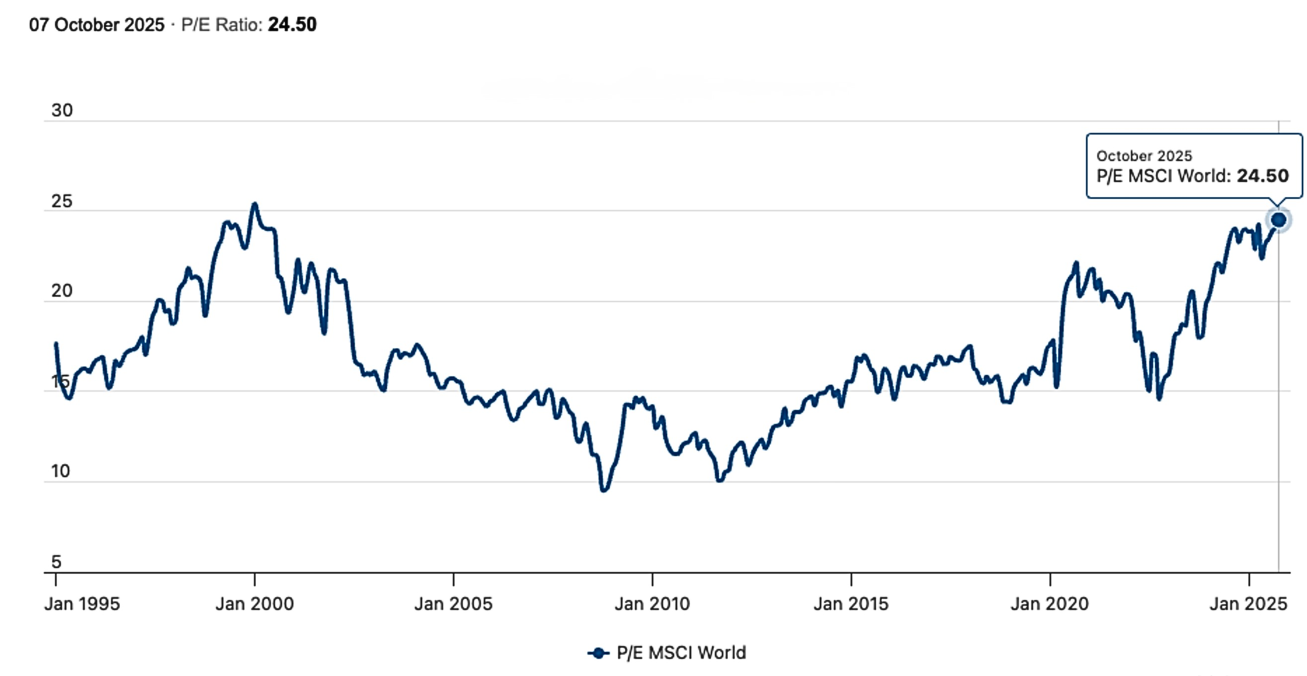 This leads to a bifurcation: either companies will revise down earnings expectations-potentially triggering market corrections-or investors will be asked to accept even higher forward multiples, compounding valuation risk. As the below chart shows, we are already at peak equity multiple on MSCI World.